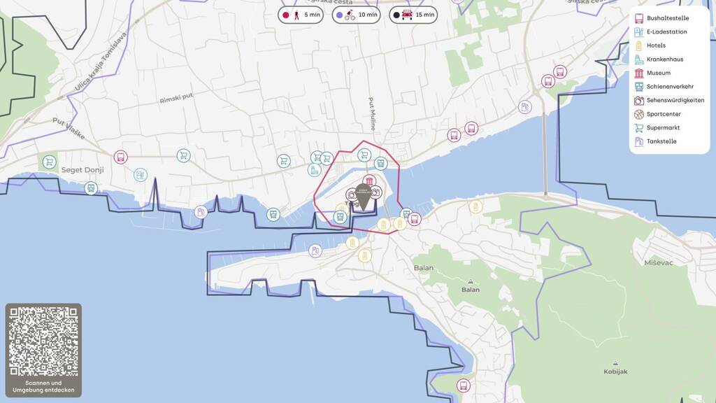 Der Flughafen Split ist nur 5 km entfernt und ermöglicht eine schnelle Anbindung an internationale Reiseziele. Die Lage kombiniert Ruhe, Natur und Nähe zu urbaner Infrastruktur und Sehenswürdigkeiten.