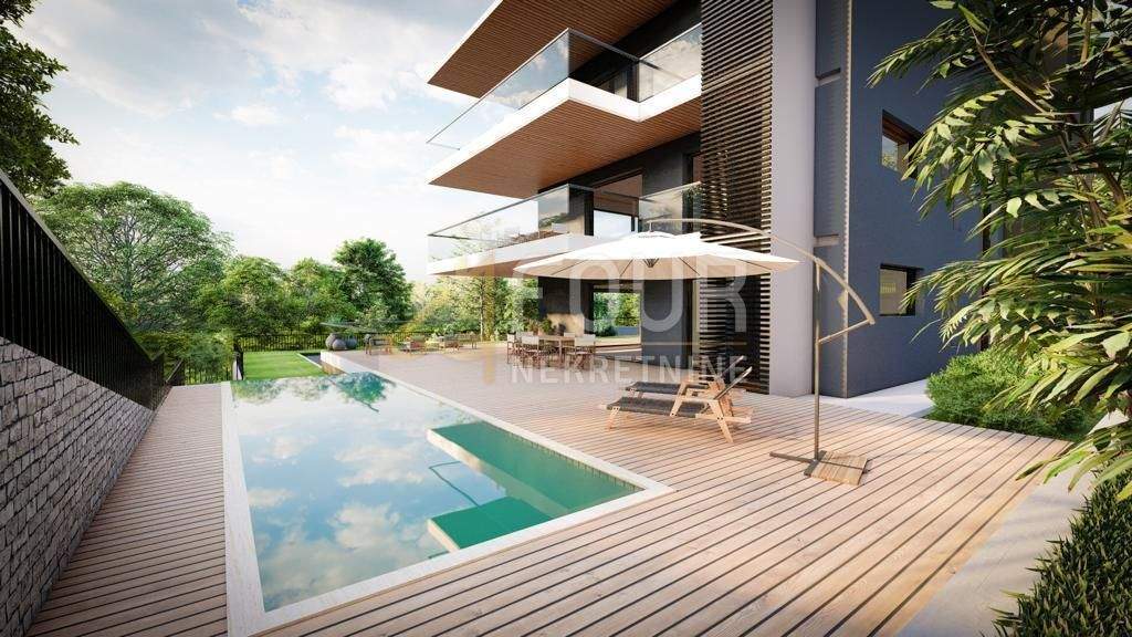 Besonderen Wert bietet der beeindruckende Außenbereich - eine Terrasse von 42,14 m2, eine Holzterrasse von 48,74 m2, ein Pool von 24 m2 und ein Garten von 119,43 m2.