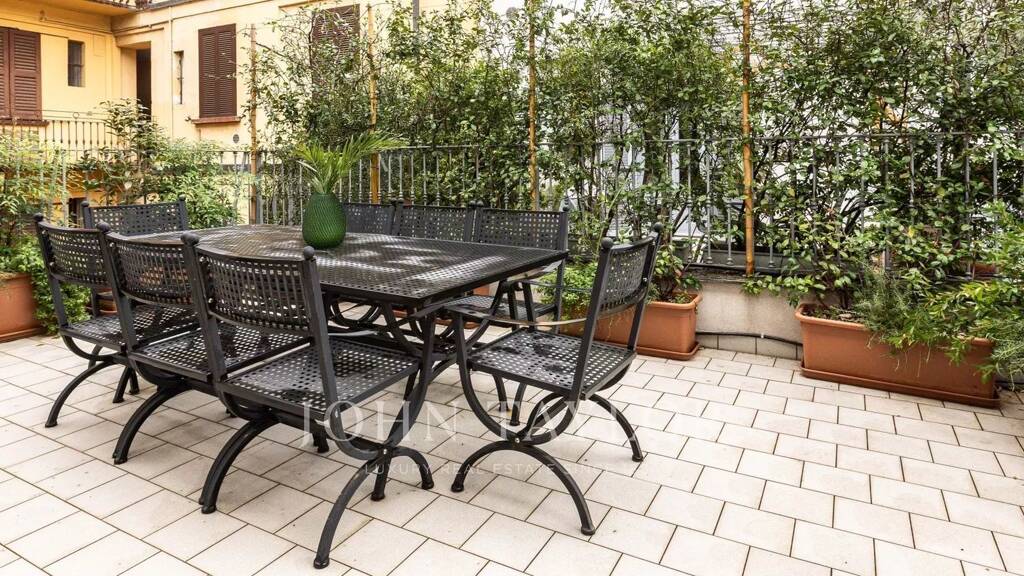 EXCLUSIVE PROPERTY WITH ENCHANTING TERRACE in an elegant prestigious context, splendid apartment. Milanese style apartment full of charm with habitable furnished and planted terrace on a quiet internal courtyard. Very versatile environments. Characteristic apartment, 85 sqm. approx. very bright and quiet consisting of entrance hall, large living area with kitchen, overlooking the terrace, 2 double bedrooms and two splendid bathrooms. Precious period details with an excellent internal layout, to create a splendid contemporary atmosphere. Cutting-edge technical equipment and systems. Fully furnished residence with exclusive