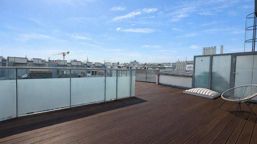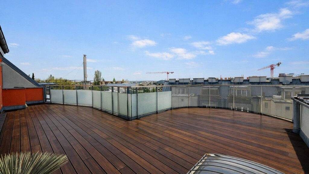 Die Dachterrasse bietet reichlich Platz für Lounge-Möbel, Grillbereich oder Urban Gardening - ein privates Outdoor-Wohnzimmer über der Stadt.