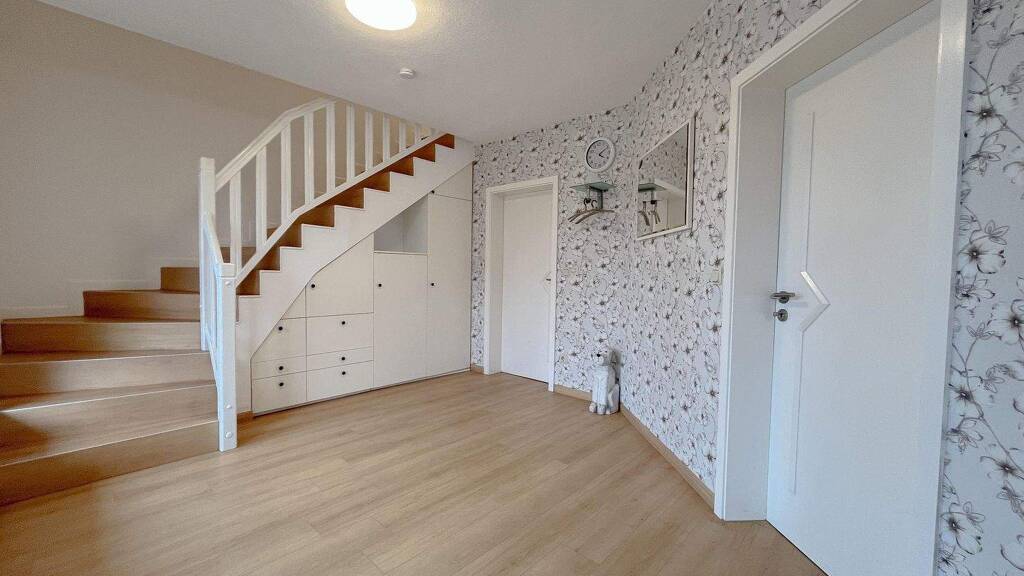 Im Erdgeschoss erwarten Sie ein großzügiges, lichtdurchflutetes Wohnzimmer sowie eine Küche mit einer wirklich sehr schönen Einbauküche. Vom Wohnzimmer aus gelangen Sie direkt auf die schöne, überdachte Terrasse, die zu entspannten Stunden im Freien einlädt und einen harmonischen Übergang in den Garten schafft. Der Garten ist pflegeleicht angelegt. Ergänzt wird das Erdgeschoss durch einen praktischen Hauswirtschaftsraum, der einen direkten Zugang zum Carport bietet.