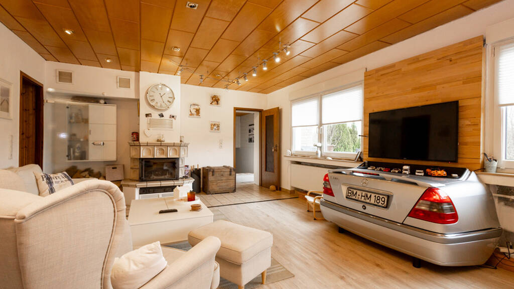 Von der Küche aus betreten Sie sodann den geräumigen Wohn- und Essbereich, welcher den Zugang in das innenliegende Treppenhaus und auf den großzügigen Balkon mit Weitblick über Wiesen und Felder freigibt. Der Kaminofen sorgt insbesondere in der kalten Jahreszeit für Gemütlichkeit.