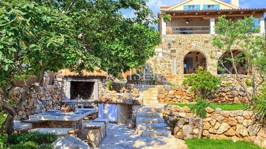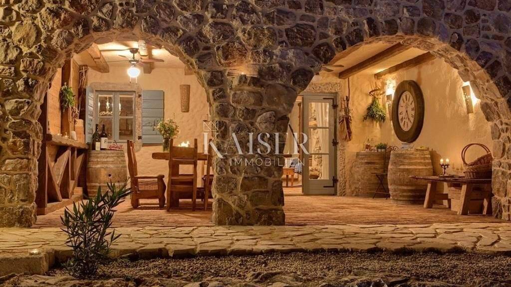 Die Immobilienagentur Kaiser Immobilien präsentiert Ihnen eine adaptierte autochthone Steinvilla mit Swimmingpool in sehr ruhiger Lage in der Nähe von Malinska. Das Anwesen liegt in einer bewaldeten Bucht an der Westküste der Insel Krk. Die Villa mit Garten hat eine Gesamtfläche von 1020 m2 brutto. Es erstreckt sich über drei Etagen und besteht aus dem Erdgeschoss, wo sich ein geräumiges Wohnzimmer befindet, das einen angenehmen Raum zum geselligen Beisammensein und Entspannen bietet, eine Küche mit Esszimmer und eine schöne Loggia. Im ersten Stock gibt es ein Badezimmer und zwei Schlafzimmer, die direkten Zugang zu einer schönen Terrasse mit Blick auf das Meer haben, während sich im dekorierten Dachgeschoss zwei weitere Zimmer mit Bad befinden. Ein nützlicher Komfort ist eine zusätzliche Außentoilette, die vom Außenbereich aus leicht zugänglich ist. Der verborgene Vorteil dieser Villa ist ein wunderbarer Weinkeller, der Ihnen die Möglichkeit bietet, verschiedene Weine aufzubewahren und zu genießen. Die Beheizung der Villa wird durch eine Wärmepumpe ermöglicht, die zusammen mit der Fußbodenheizung eine effiziente Möglichkeit zur Beheizung des Raumes bietet, es gibt aber auch Kovektoren zum Heizen und Kühlen, eine Klimaanlage und einen Kamin, die zusätzlich dazu dienen Als dekoratives Element dient es der Beheizung der Räume und schafft so eine angenehme und warme Atmosphäre. Das Bewässerungssystem erleichtert die Pflege und Pflege des Gartens. Die Nähe zum Meer beträgt 1700 Meter und neben der Nähe zum Meer befindet sich die Immobilie in unmittelbarer Nähe zu allen wichtigen Annehmlichkeiten. Für weitere Informationen wenden Sie sich bitte an einen Vertreter.