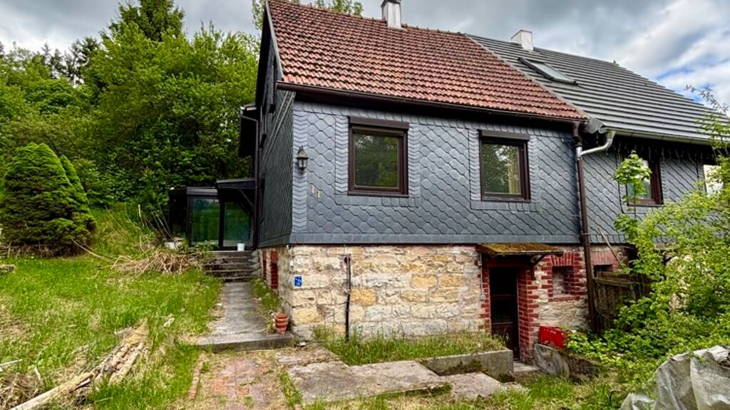 Diese naturnahe Doppelhaushälfte in ruhiger und naturnaher Lage von Schalkau bietet viel Platz für Familien oder Paare, die sich den Traum vom eigenen Zuhause verwirklichen möchten. Das Haus verfügt über einen großen Garten mit einer praktischen Holzhütte sowie einen beheizten Wintergarten, der 2003 angebaut wurde und ganzjährig genutzt werden kann. Im Erdgeschoss erwarten Sie ein Wohnzimmer, eine Küche mit angrenzendem Raum zur flexiblen Nutzung, ein weiteres großes Zimmer mit Zugang zum Wintergarten sowie ein Badezimmer mit Badewanne. Im Obergeschoss befinden sich drei weitere Zimmer, die individuell als Schlaf-, Kinder-, Arbeits- oder Abstellzimmer gestaltet werden können. Der Keller bietet zusätzlichen Stauraum und ist direkt von der Küche aus zugänglich. Das Objekt ist renovierungsbedürftig - bietet Ihnen dadurch jedoch die ideale Gelegenheit, es ganz nach Ihren eigenen Vorstellungen zu modernisieren und umzugestalten. So können Sie ein Zuhause schaffen, das perfekt zu Ihnen passt.