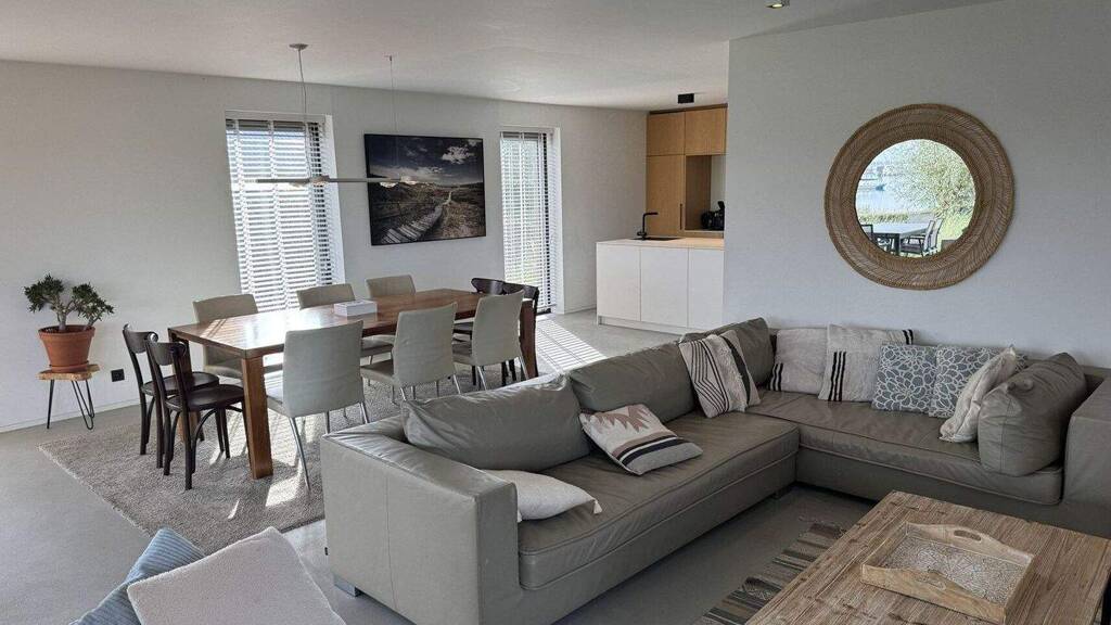 Großzügiges, 54 m² großes Wohnzimmer mit offenem Grundriss, Esstisch für 10 Personen und Sitzecke mit 55-Zoll-Fernseher und Blick auf Garten und Wasser. Ein Gaskamin mit Fernbedienung und ein großes Schiebefenster bieten Zugang zur Terrasse und zum Garten. Ein abschließbarer Abstellraum steht dem Eigentümer zur Verfügung.