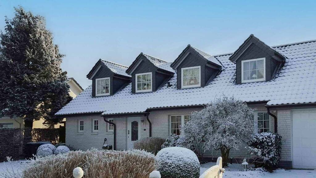 Schon in der Auffahrt bemerkt man das Besondere. Die ins Haus integrierte Doppelgarage fügt sich stimmig in die helle Fassade ein. Die Sprossenfenster, die glasierten Dachpfannen und die mit Schiefer verkleideten Gauben geben der Immobilie einen klassischen Look, der nie aus der Mode kommt. Der Vorgarten ist einladend gestaltet und wird durch einen Friesenwall begrenzt. Der geschwungene mit Granit gepflasterte Weg zur Eingangstür wird von immergrünen Pflanzen gesäumt.