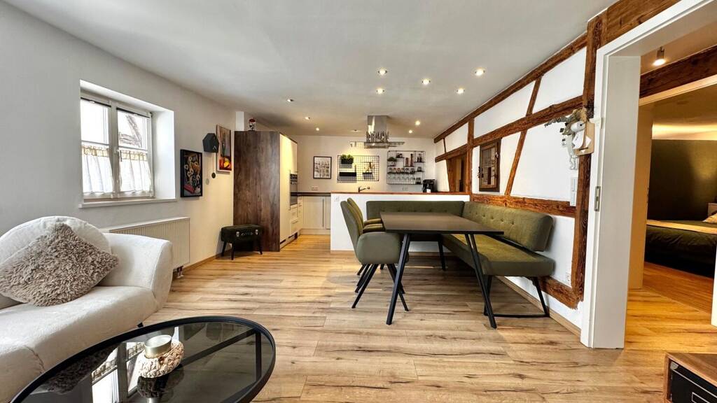 Willkommen zu einem außergewöhnlichen Immobilienangebot: Diese großzügige Etagenwohnung mit einer Wohnfläche von ca. 80 m² verbindet historischen Charme mit zeitgemäßem Wohnkomfort. Das Gebäude stammt aus dem Baujahr 1500 und wurde umfassend modernisiert - zuletzt 2020 mit dem Einbau einer neuen Gastherme sowie hochwertigen Bodenbelägen im Schlafzimmer und Arbeitszimmer. Bereits 2017 erfolgten eine vollständige Modernisierung der Einbauküche, die Erneuerung aller Bodenbeläge sowie eine Neugestaltung des Badezimmers. Eine grundlegende Sanierung wurde im Jahr 1996 durchgeführt, sodass heute ein zeitgemäßer Zustand erreicht wird.