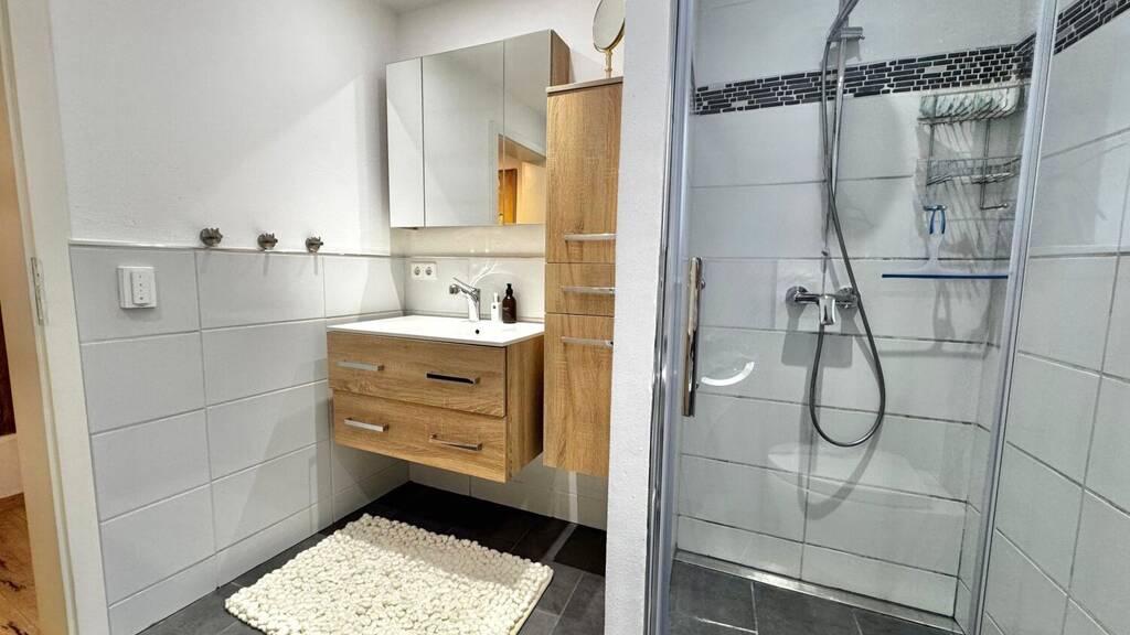 Die beiden Schlafzimmer sind durchdacht gestaltet, wobei eines der Zimmer über einen abgetrennten Ankleidebereich verfügt. Die modernen Bodenbeläge unterstreichen den ansprechenden Gesamteindruck. Das Tageslichtbad bietet mit einer bodengleichen Dusche, zeitgemäßen Badmöbeln und geschmackvoller Gestaltung hohen Komfort. Das Sichtfachwerk verleiht einzelnen Räumen einen besonderen Charakter und erinnert an die Geschichte des Hauses, ohne auf Komfort verzichten zu müssen.