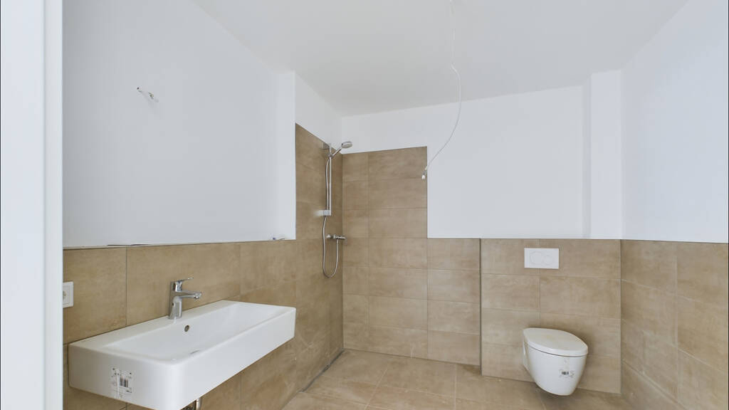Der offene Wohn-, Ess- und Kochbereich mit hochwertigem Parkettboden und Anschlüssen für eine eigene Einbauküche schafft eine stilvolle Atmosphäre und bietet direkten Zugang zur überdachten Loggia, die sich perfekt zum Entspannen eignet. Das Schlafzimmer bietet ausreichend Platz für individuelle Gestaltungsmöglichkeiten. Das Badezimmer mit großzügiger Dusche sorgt für ein angenehmes Wohlfühlambiente.