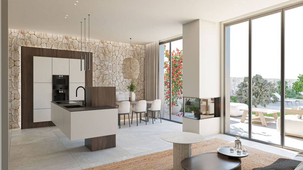 Details der Innenverkleidung wie Steinmauerwerk in der Küche oder Mikrozement in den Bädern tragen zur Isolierung bei und verleihen dem Haus eine modern Ästhetik, während die mallorquinische Tradition erhalten bleibt.