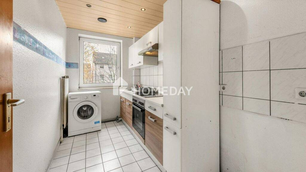Die Küche ist mit einer gepflegten Einbauküche ausgestattet und bietet ausreichend Platz zum Kochen. Das Schlafzimmer liegt angenehm ruhig, während das Bad mit Dusche und Badewanne ausgestattet ist und insgesamt einen sauberen, gepflegten Eindruck vermittelt. Fliesen und Laminat schaffen ein wohnliches Ambiente, das leicht zu pflegen ist.