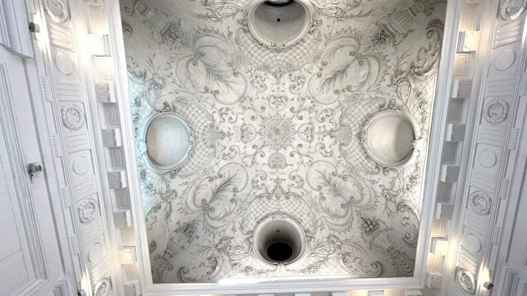 Auch das Entrée des Gebäudes beeindruckt durch ihre feinbearbeitete Stuckdecke. Mit ca. 6 flachen Stufen ist der Lift erreichbar.
