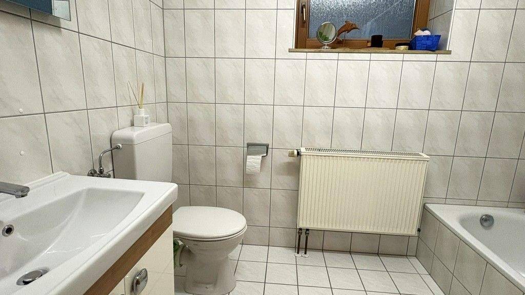 Im Erdgeschoss befinden sich zwei Schlafzimmer, das große Wohnzimmer und ein Essbereich mit offener Küche, in der eine Einbauküche eingepasst ist. Sowohl vom Essbereich als auch vom Wohnzimmer aus ist die überdachte Terrasse zur Südseite zu begehen. Das Tageslichtbad ist mit einer großen ebenen Dusche, Waschbecken und WC ausgestattet. Das Untergeschoss ist direkt vom Flur im Erdgeschoss aus zu erreichen. Hier bieten ein großes Zimmer/ Hobbyraum sowie ein zusätzliches Bad weitere wohnlich nutzbare Flächen. Des Weiteren gibt es im Untergeschoss noch Lagerflächen, Waschkeller und Heizungsraum. Im Dachgeschoss befinden sich zwei Schlafzimmer, ein Wohnraum mit Küchenanschlüssen sowie ein Wannenbad. Dieser Bereich war auch in der Vergangenheit schon als separate Wohnung vermietet. Das Haus wird über eine Gaszentralheizung der Marke VIESSMANN, Bj. 1996 beheizt. Die Fenster sind Holzfenster mit Isolierverglasung und Rollläden. 2022 wurden die Dachfenster erneuert und mit solarbetriebenen Rollläden versehen. Auf der Fassade wurde eine Gewebeverstärkung aufgetragen und ein neuer Reibeputz angebracht.