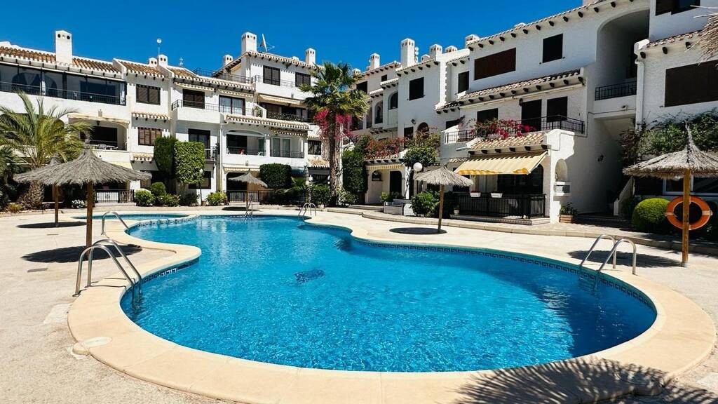 Die Immobilie befindet sich in der Calle Poniente innerhalb einer ruhigen Wohnanlage, umgeben von Restaurants, Geschäften und Wohngebieten und nur wenige Minuten von den Stränden und der Promenade entfernt. Mit einer Wohnfläche von 59 m² befindet sich die Wohnung im Erdgeschoss und ist in gutem Zustand, was sie zu einer hervorragenden Gelegenheit sowohl als Hauptwohnsitz, Ferienimmobilie oder Investition macht. Der Wohnbereich besteht aus einem hellen Wohn-Esszimmer mit integrierter Küche, wodurch ein funktionaler und komfortabler Raum entsteht. Von hier aus gelangt man auf eine angenehme Terrasse, ideal um das mediterrane Klima zu genießen. Der Schlafbereich verfügt über zwei Schlafzimmer mit Einbauschränken sowie ein komplettes Badezimmer. Die Immobilie verfügt außerdem über Climalit-Doppelfenster für eine gute Wärme- und Schalldämmung sowie einen privaten Parkplatz. Die Wohnanlage bietet einen Gemeinschaftspool und gepflegte Gemeinschaftsbereiche, perfekt um das ganze Jahr über das gute Klima zu genießen. Eine praktische und komfortable Immobilie für alle, die den mediterranen Lebensstil in Orihuela Costa genießen möchten.