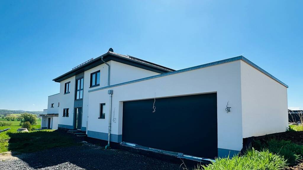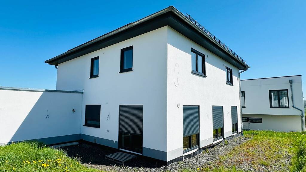 Dieses Einfamilienhaus mit Doppelgarage wurde in 2022/23 durch die Fima Favorit Massiv Haus errichtet. Es handelt sich um ein KfW 55-Haus und wird mit einer Luft-Wasser-Wärmepumpe mit Fußbodenheizung beheizt. Ein Kaminanschluss ist vorhanden. Die Außenwände wurden mit Hochlochziegel 36,50 cm und dreifach verglasten Fenstern mit einem U-Wert von 0,9 sowie elektrischen Rollos errichtet. Die Bodenplatte hat eine 8 cm starke Dämmung erhalten. Ebenso ist eine dezentrale Lüftungsanlage ohne Wärmerückgewinnung installiert. Selbstverständlich ist auch eine Photovoltaik-Anlage mit Batteriespeicher (9,6 kW) verbaut. Eine Enthärtungsanlage und eine Zisterne mit 8.000 Litern runden dieses Angebot ab. Die Außenanlage können Sie nach Ihren eigenen Vorstellungen anlegen. Die neuwertige und großzügige Einbauküche mit Elektrogeräten (eingebaut 2024; noch unbenutzt) soll separat an die neuen Käufer für 20.000 € verkauft werden.