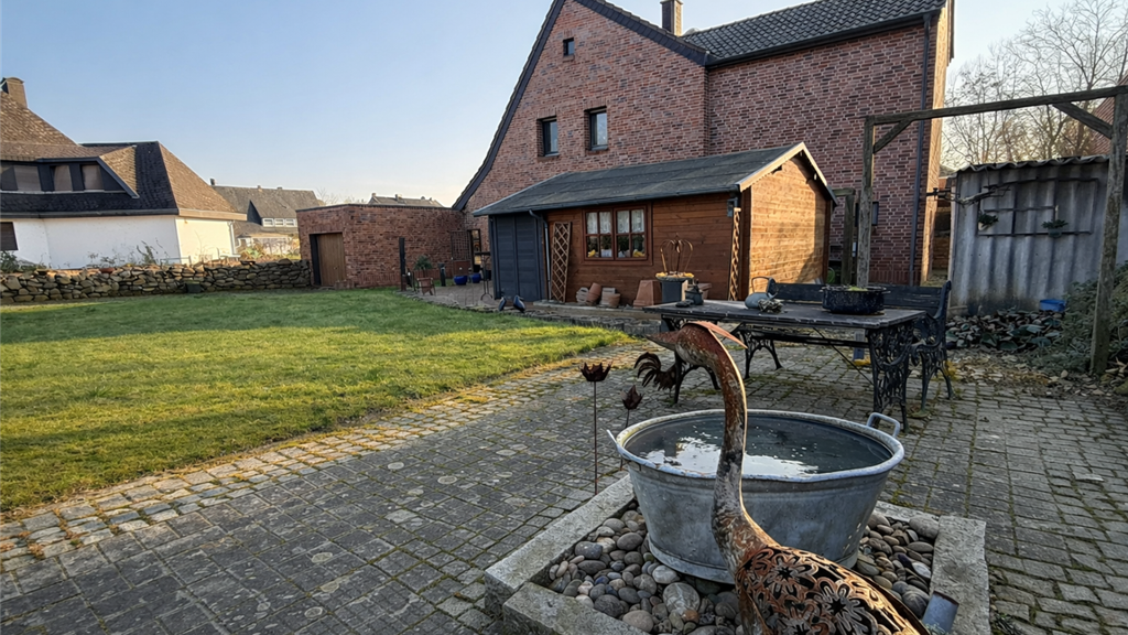 Auch der Außenbereich bietet zahlreiche praktische Vorteile. Auf dem Grundstück befindet sich eine Gartenhütte, die zusätzlichen Stauraum für Gartengeräte oder Werkzeuge bietet. Zudem ist im Garten ein Brunnen vorhanden. Das Grundstück ist von zwei Seiten befahrbar, was eine besonders komfortable Zufahrt ermöglicht.