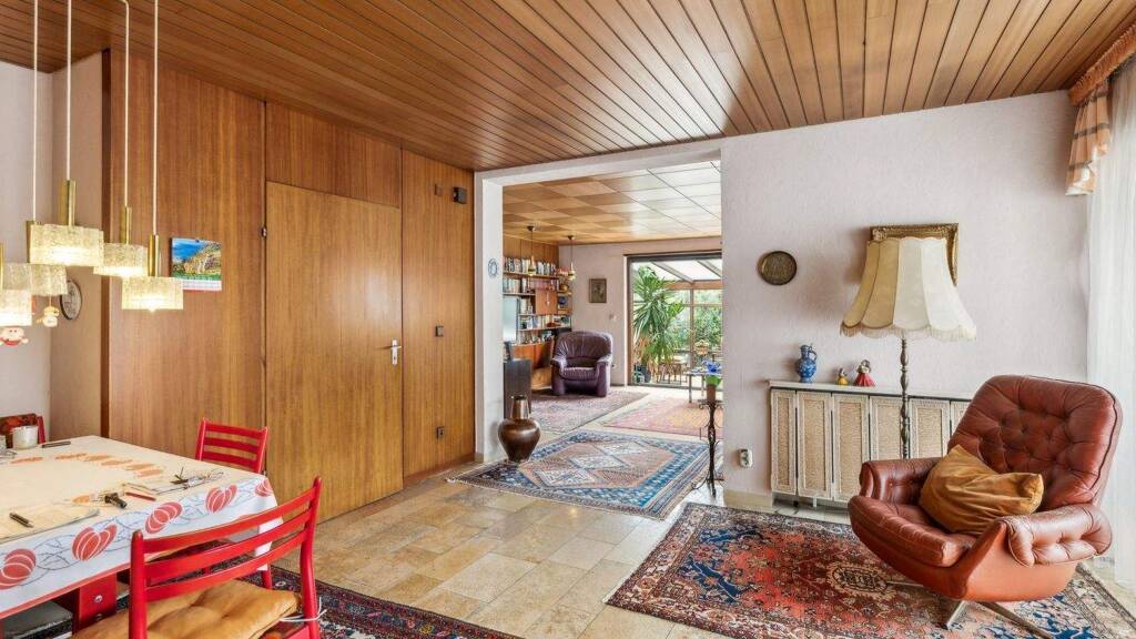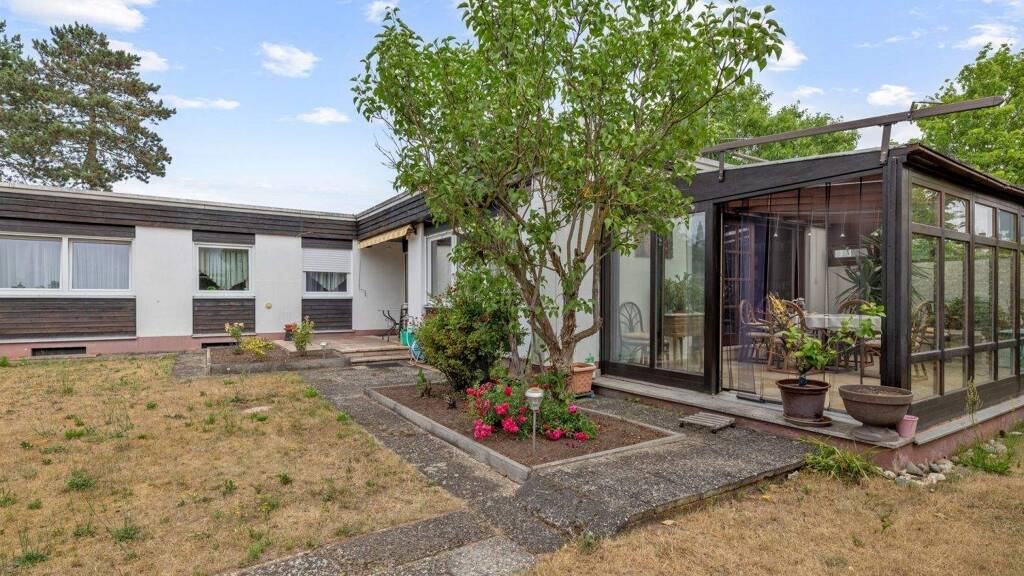 Dieser Bungalow aus ca. 1970 befindet sich in einer ruhigen Wohnlage und bietet auf einer Ebene rund 130?m² Wohnfläche auf einem ca. 512 m² großen Grundstück. Der durchdachte Grundriss umfasst ein großzügiges Wohnzimmer mit Zugang zum Wintergarten (Anbau von ca. 1985), der durch seine elektrische Markise auch an sonnigen Tagen angenehmen Komfort bietet. Die Küche ist mit einer Einbauküche ausgestattet, deren Einrichtung älteren Baujahrs entspricht. Neben dem großen Windfang bietet das Erdgeschoss insgesamt 4 Zimmer (Schlafzimmer, Kinderzimmer, Büro und Wohnzimmer), Küche, Bad und Gäste-WC mit überwiegend gefliesten Böden sowie Teppich. Kunststoff-Doppelisolierfenster wurden größtenteils ca. 1998 erneuert und sorgen für gute Dämmwerte.