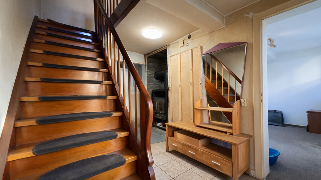 Im Obergeschoss, mit einer Deckenhöhe von ca. 1,70 m bis 1,80 m, befinden sich insgesamt vier Zimmer, darunter zwei Durchgangszimmer. Im Hauptschlafzimmer wurde zusätzlich eine separate Toilette installiert. In einem weiteren Raum sind der Wechselrichter der ca. 4,8 kWp starken Photovoltaikanlage sowie der 5 kW Batteriespeicher untergebracht. Von hier aus gelangt man auf den trockenen Dachboden, der zusätzlichen Stauraum bietet.