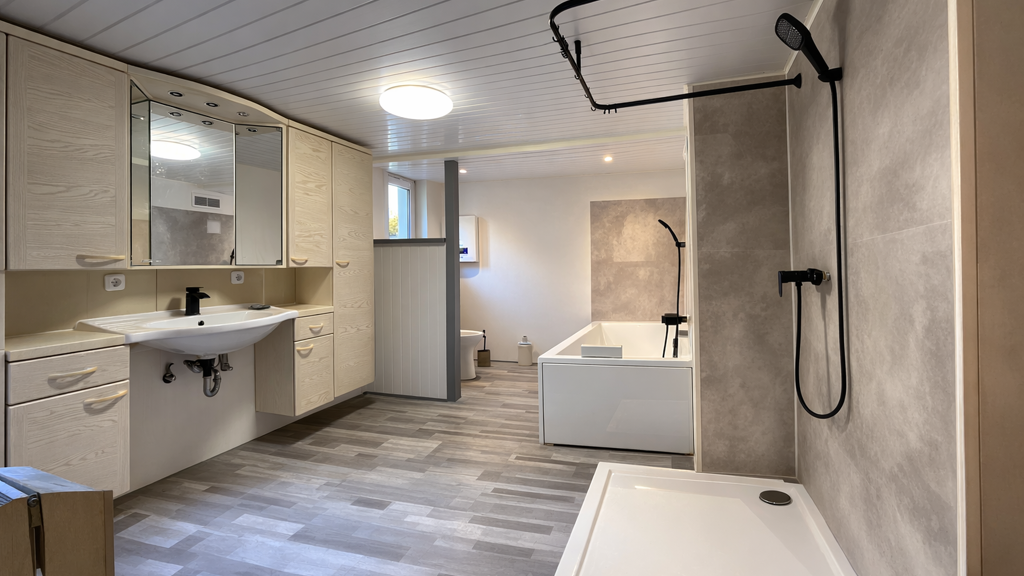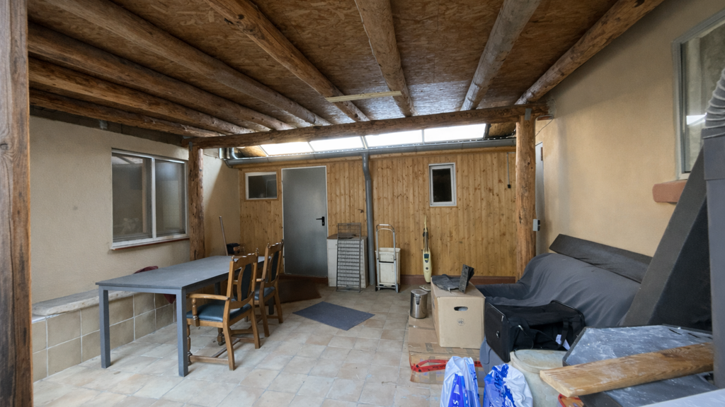 Im Erdgeschoss befinden sich ein gemütliches Wohnzimmer, ein separates Arbeitszimmer, die Küche sowie ein neu errichtetes Badezimmer mit Badewanne und Dusche. Von der Küche aus gelangt man direkt auf den überdachten Freisitz mit Heizofen, der ganzjährig genutzt werden kann und einen geschützten Übergang zu weiteren Gebäudeteilen bildet. Vom Freisitz erreicht man die neu errichtete Waschküche sowie einen Lagerraum. Ebenfalls gelangt man von hier in den ehemaligen Stall, über welchen man Zugang zum Garten mit weiterem Unterstand hat. Dort stehen zusätzliche Stellflächen für Fahrzeuge, Wohnwagen oder Anhänger zur Verfügung.
