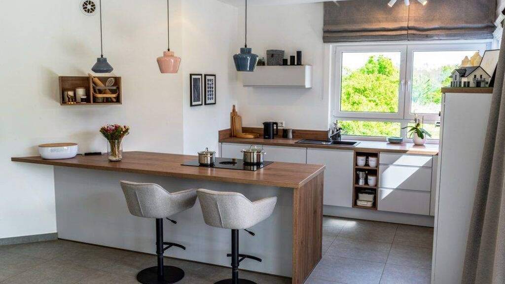 Im Erdgeschoss lädt Dich eine offene Küche ein, die nahtlos in den großzügigen Wohn- und Essbereich übergeht. Ob gemütliches Familienfrühstück oder gesellige Abende mit Freunden - hier ist Platz für all Deine Momente. Die elegante Echtholztreppe im Eingangsbereich setzt dabei ein stilvolles Highlight.