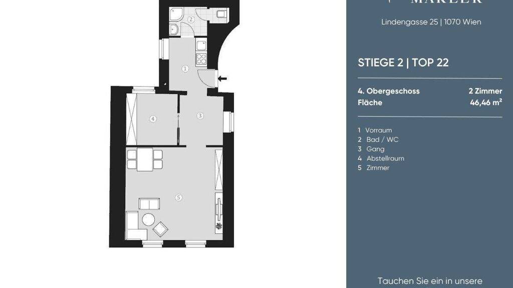 Dieses möblierte Apartment verfügt über knapp 47 m² Wohnfläche und überzeugt durch eine optimale Raumaufteilung und die zentrale Lage im 7. Bezirk. Sie besticht durch ihren durchdachten Grundriss und teilt sich wie folgt auf:
