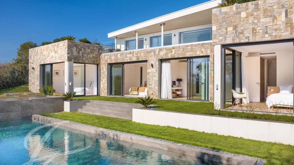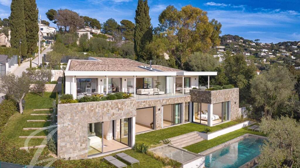 Wunderschöne neue zeitgenössische Villa in dominanter Lage mit Meer- und Esterelblick in einer begehrten Gegend, ruhig gelegen und nur wenige Gehminuten von den Geschäften in Le Cannet entfernt.