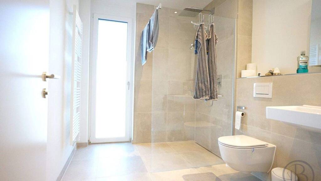 Das Badezimmer ist zeitgemäß ausgestattet und überzeugt durch eine klare, pflegeleichte und helle Gestaltung.