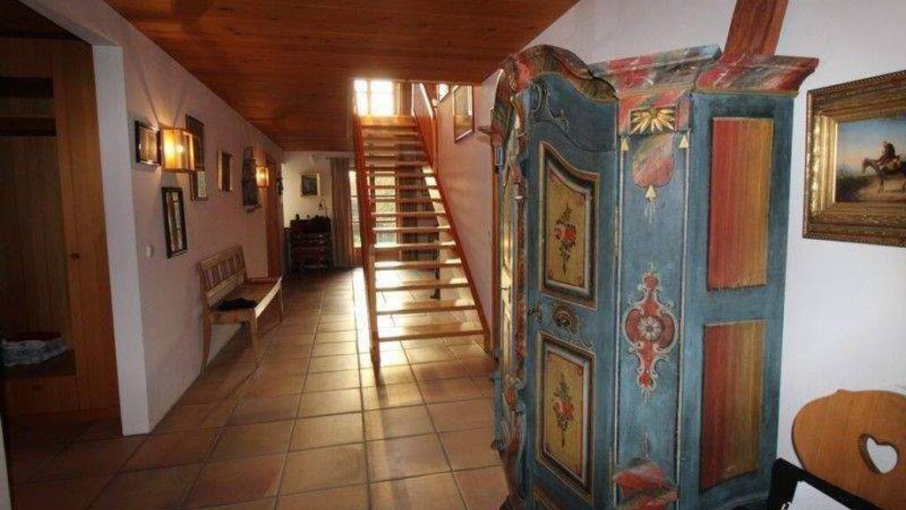Man betritt das Haus über ein geräumiges Entrée mit Garderobe, Gäste-WC sowie Zugang zur Terrasse. Über das Entrée erreicht man das großzügige Wohnzimmer, das geräumige Esszimmer mit Kachelofen sowie die angrenzende Küche mit Einbauküche, Speisekammer und Abstellraum. Ein separater Bereich mit Schlafzimmer und Duschbad rundet das Raumprogramm auf dieser Ebene ab.