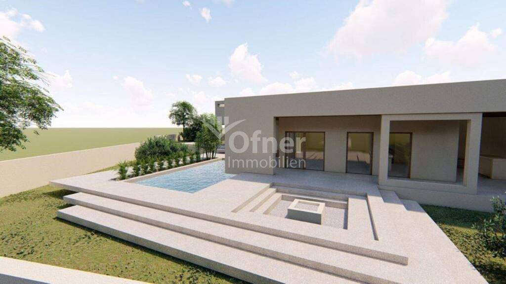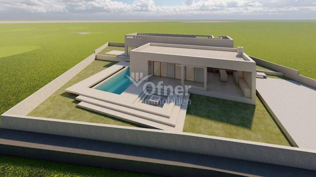 Für dieses Grundstück liegen eine gültige Baugenehmigung sowie ein genehmigtes Hauptprojekt vor. Die Genehmigung sieht den Bau eines Hauses mit einer Netto-Nutzfläche von 168,65 m² vor, das in zwei Phasen errichtet wird. In der ersten Phase entstehen der Eingangsbereich, ein Außenspeicher, zwei Schlafzimmer, zwei Badezimmer, eine Küche und ein Wohnzimmer. Zudem werden eine Außenterrasse mit Sommerküche sowie ein Pool mit den Maßen 8×4,70 m (37,18 m²) samt Technikraum gebaut. Nach Abschluss der ersten Bauphase ist das Haus voll nutzbar. In der zweiten Phase sind die Erweiterung um ein Hauptschlafzimmer mit eigenem Bad, ein Fitnessraum sowie die Gestaltung einer offenen Feuerstelle (Fire Pit) vorgesehen.
