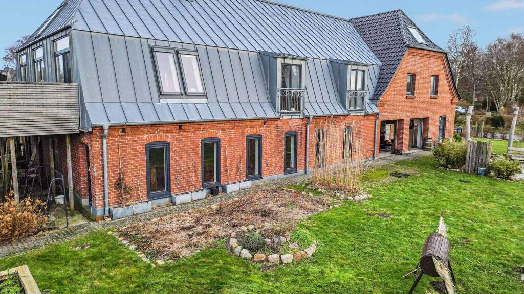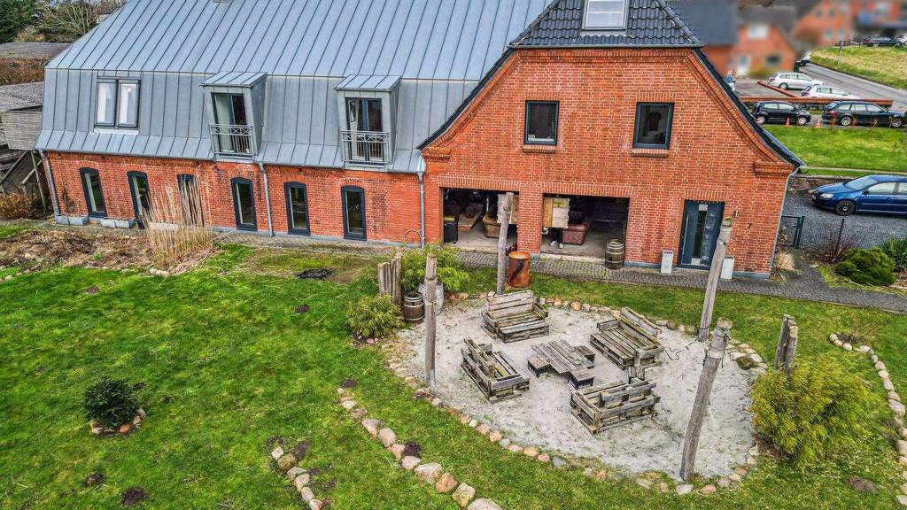 In Viöl, zentral gelegen zwischen Schleswig, Flensburg und Husum, präsentiert sich dieses einzigartige, ehemalige Bauernhaus mit einer beeindruckenden Wohnfläche von ca. 291 m² sowie einer zusätzlichen Nutzfläche von ca. 233 m². Auf einem großzügigen Grundstück von 1363 m² bietet dieses Anwesen eine perfekte Kombination aus Tradition und Moderne. Im Jahr 2005 vollständig neu aufgebaut, bewahrt das Haus dennoch die Geschichte und den Charme des ehemaligen Bauernhauses. Der äußere Anblick wird durch die auffälligen roten Ziegelsteine und der Zinkblecheindeckung betont. Die Deckenhöhe von ca. 6 Metern im Wohn- und Essbereich schenken Luft und Raum zum Leben. Die Holzbalken im Inneren des Hauses schaffen in Kombination mit modernen Elementen ein warmes und einladendes Ambiente. Für Wärme und Gemütlichkeit sorgt ein Holzofen. Die Beheizung des Hauses erfolgt mittels Gas, während derzeit zusätzlich ein ortseigenes Wärmenahversorgungskonzept entwickelt wird. Des Weiteren steht eine Fußbodenheizung zur Verfügung. Das Haus verfügt über insgesamt 6,5 Zimmer. Durch den großzügigen Eingangsbereich gelangen Sie über eine Treppe in das 1. Obergeschoss. Vom Flur abgehend befinden sich vier quadratisch geschnittene Zimmer, die derzeitig als Kinder- und Gästezimmer sowie als Büro genutzt werden. Ein modern ausgestattetes Badezimmer mit Dusche und Badewanne befindet sich direkt angrenzend. Eine Besonderheit ist der großzügige, lichtdurchflutete Wohn- und Essbereich (ca. 82 m²) mit einer modernen Küche, die keine Wünsche offen lässt. Über die Wendetreppe und die Galerie gelangt man zu den Räumlichkeiten des Dachgeschosses. Hier erwartet Sie ein Schlafzimmer mit Ankleide sowie ein modernes Badezimmer mit Dusche und Badewanne. Ein weiteres Highlight des Hauses ist der Partyraum im Erdgeschoss mit angrenzender Garage und Lagerraum. Mit einer Nutzfläche von ca. 233 m² besteht damit ausreichend Platz für anstehende Events und private Feiern. Hierzu wurde kürzlich seitens des Eigentümers ein Antrag auf Nutzungsänderung als Gewerbeeinheit gestellt und befindet sich aktuell in Bearbeitung bei der zuständigen Behörde.