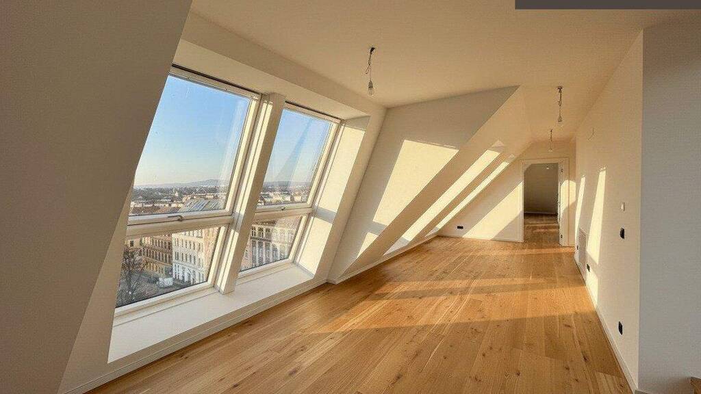 Im oberen Dachgeschoss befindet sich der offen gestaltete Wohn-, Koch- und Essbereich - ein heller, einladender Raum, der durch die große Terrasse nahtlos nach außen erweitert wird. Vom lichtdurchfluteten Wohnbereich aus eröffnet sich ein beeindruckender Ausblick auf die Gloriette, der dem Wohnraum eine ganz besondere Atmosphäre verleiht. Die großzügige Freifläche mit Lärche-Dielen bietet Platz für Lounge, Esstisch oder Pflanzen und schafft einen privaten Rückzugsort über den Dächern Penzings.