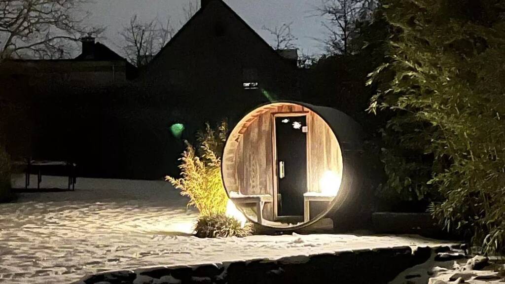 Der Garten präsentiert sich als luxuriöser Wellnessgarten. Hier können Sie im Naturschwimmteich schwimmen, im Whirlpool entspannen oder in der rustikalen Fasssauna neue Energie tanken. Eine blickdichte Hecke sorgt für Privatsphäre und macht den Außenbereich zu einer privaten Wohlfühloase.