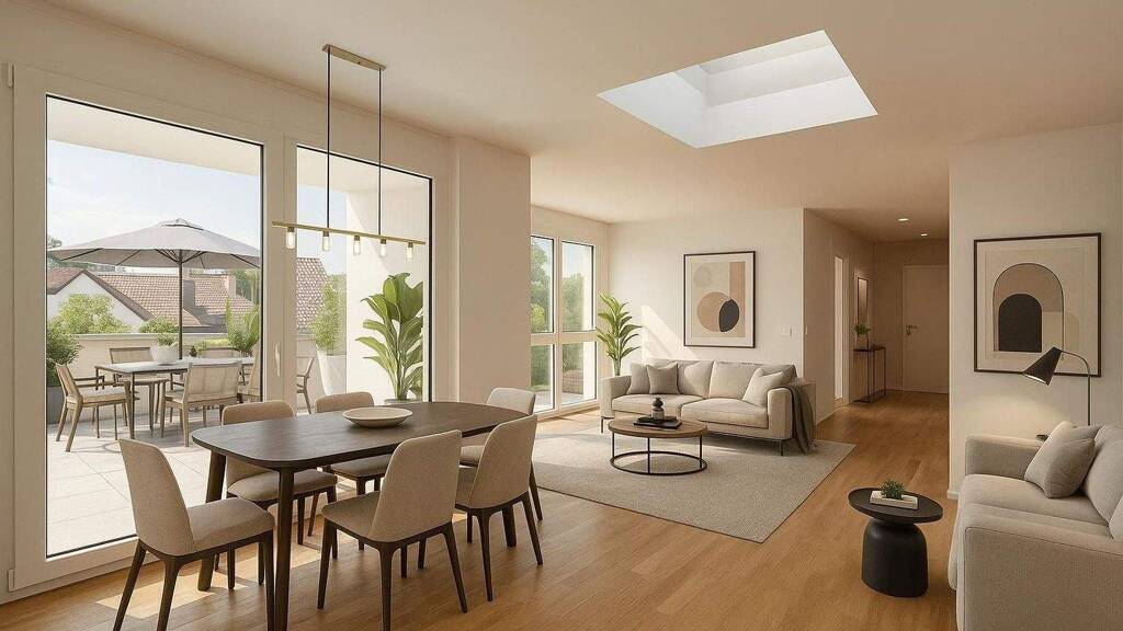 Diese exklusive 3-Zimmer-Neubauwohnung bietet Ihnen ein außergewöhnliches Wohnerlebnis. Das absolute Highlight ist die großzügige Dachterrasse mit atemberaubendem Panoramablick über Winnenden und die umliegende Natur. Ob ein entspanntes Frühstück in der Morgensonne oder ein stilvoller Ausklang des Tages bei Sonnenuntergang - dieser private Rückzugsort wird schnell zum Lieblingsplatz für erholsame Stunden im Freien.