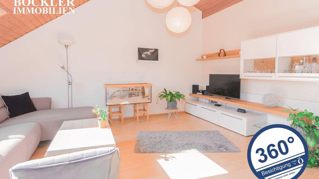 Dominante Holzdecken, die den Dachgeschoss-Charakter unterstreichen Laminatboden in Parkettoptik Wände mit Rauhfaser tapeziert und weiß gestrichen Tageslichtbad mit Badewanne und Waschbecken Einbauküche der aktuellen Mieterin kann kostenfrei übernommen werden Offene Küchengestaltung zum Wohnraum Abstellraum im Keller Außenstellplatz