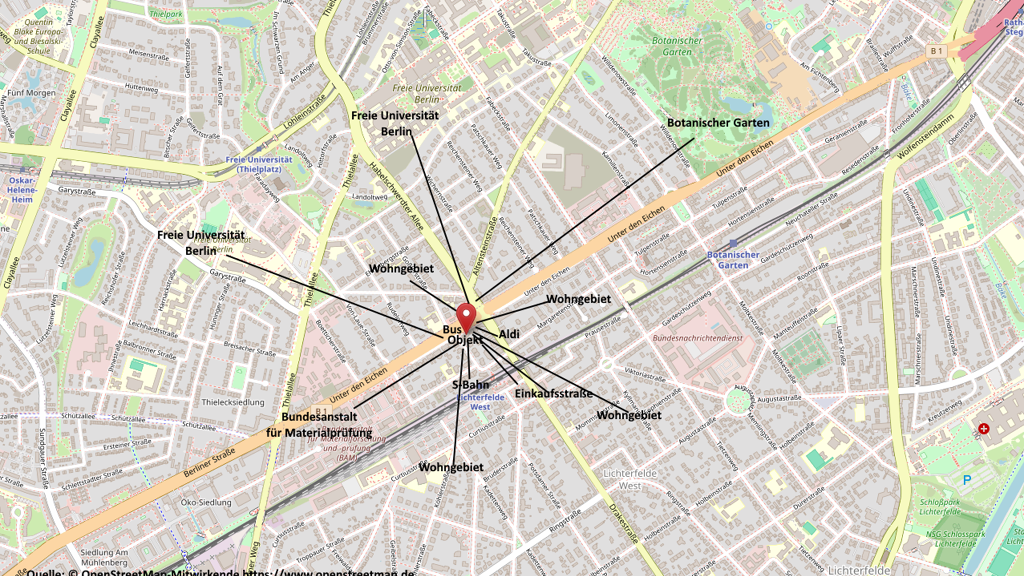Die Gewerbeeinheit befindet sich in gut sichtbarer Lage an der Straße Unter den Eichen im Berliner Ortsteil Lichterfelde (Steglitz-Zehlendorf) - einer etablierten und stark frequentierten Verbindungsachse zwischen Steglitz, Dahlem und dem südwestlichen Berliner Umland. Die Umgebung ist geprägt von einer Mischung aus Wohnbebauung, kleineren Gewerbeeinheiten sowie institutionellen Nutzungen, wodurch sich eine stabile tägliche Kundenfrequenz ergibt.