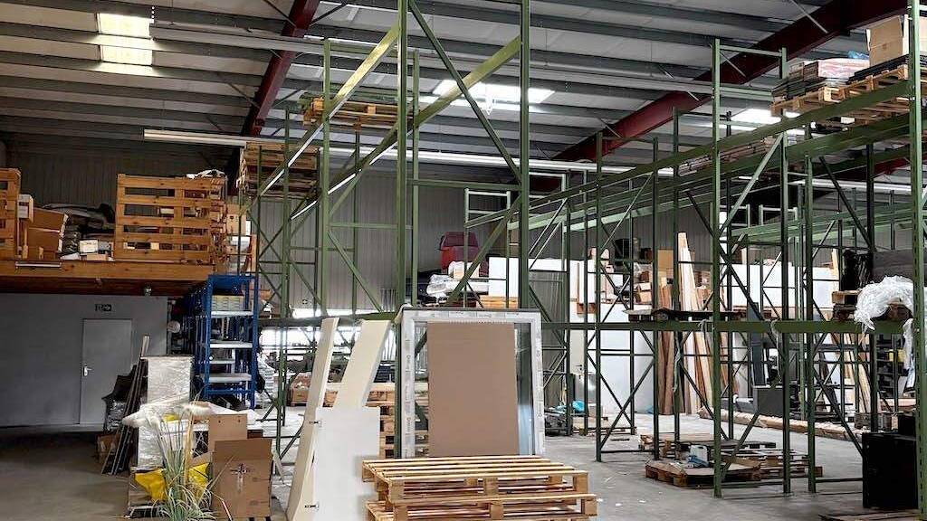 Die angrenzende beheizte Halle ist mit einem strapazierfähigen Schwerlastbetonboden ausgestattet und verfügt über Oberlichter, die für eine natürliche Belichtung sorgen. Hier finden sich zudem Schwerlastlagerregale, zusätzliche Ebenen für effiziente Lagerorganisation, ein integrierter Bürocontainer, ein separater Raum sowie eigene Sanitäreinrichtungen. Diese Ausstattung macht die Halle ideal für Lager-, Produktions- oder Werkstattzwecke.