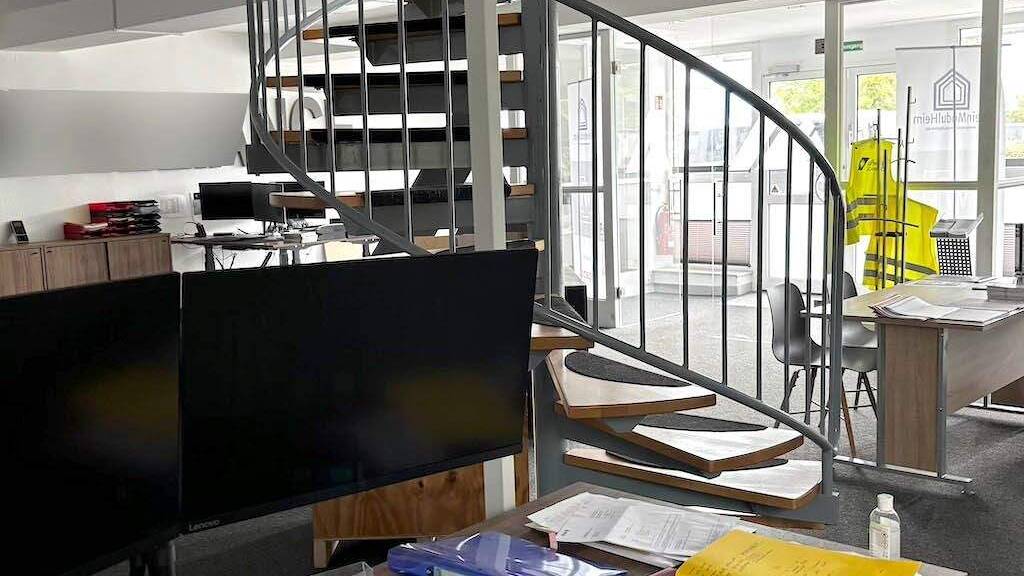 Über eine moderne Wendeltreppe gelangen Sie in das Obergeschoss, das mit einem großen Besprechungszimmer und einer geräumigen Küchenzeile überzeugt - ein idealer Ort für Meetings, Teamarbeit und kreative Pausen.