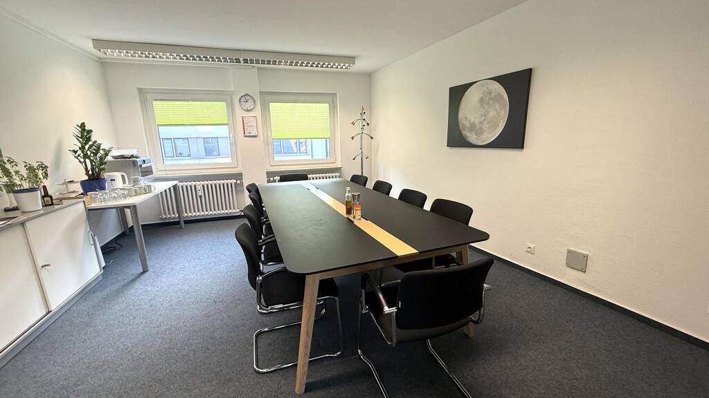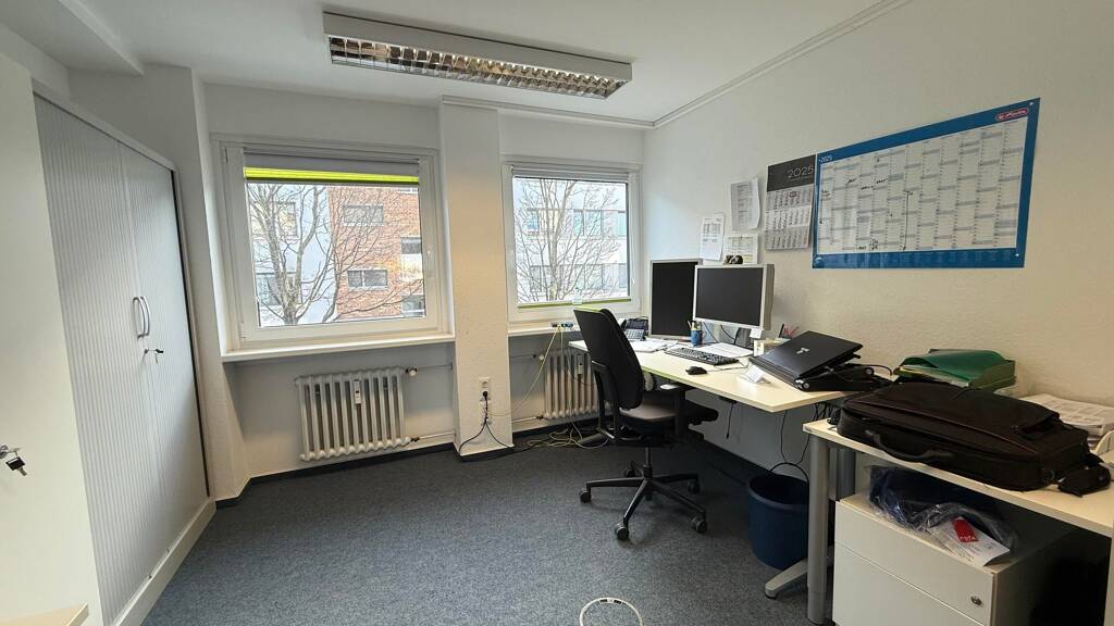 Die Bürofläche besteht aus mehreren Arbeitsräumen, einem Empfangsbereich und einer Teeküche. Die Räumlichkeiten sind hell und großzügig geschnitten und bieten ausreichend Platz für verschiedene Büroaktivitäten. Die großen Fenster sorgen für eine angenehme Belichtung der Räume und schaffen eine freundliche Arbeitsatmosphäre.
