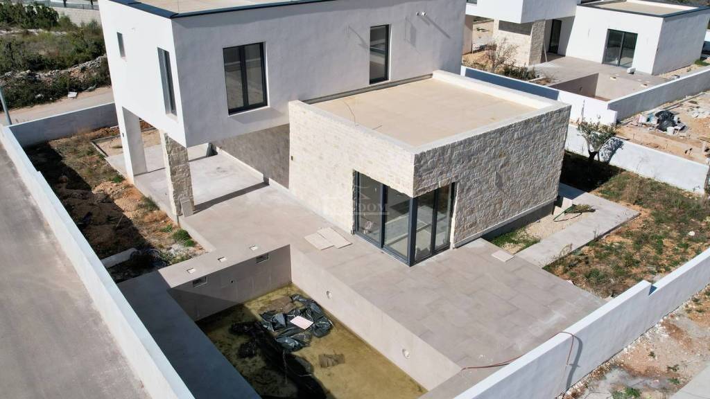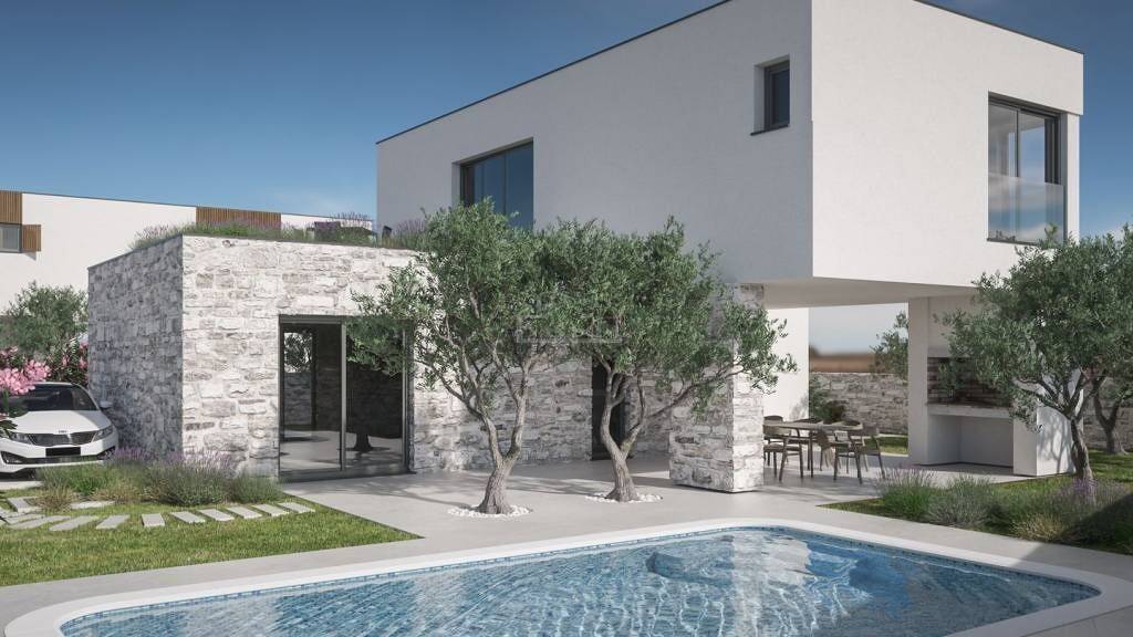 Zaton - zum Verkauf steht eine luxuriöse, urbane Villa mit Pool in ruhiger Lage. Das Haus mit einer Bruttogrundfläche von 171,20 m² (Nettowohnfläche 141,6 m²) besteht aus zwei Etagen: Erdgeschoss + Obergeschoss. Im Erdgeschoss befinden sich der Eingang, das Vorzimmer, ein Schlafzimmer, ein Badezimmer, eine offene Küche mit Essbereich sowie das Wohnzimmer mit Zugang zur teilweise überdachten Terrasse und dem Garten. Im Erdgeschoss befinden sich außerdem ein Technikraum und ein zusätzlicher Abstellraum/Lager. Über eine Innentreppe gelangt man in das Obergeschoss, wo sich der Flur, zwei Schlafzimmer, ein Badezimmer, das Hauptschlafzimmer mit eigenem Bad und eine Terrasse befinden.