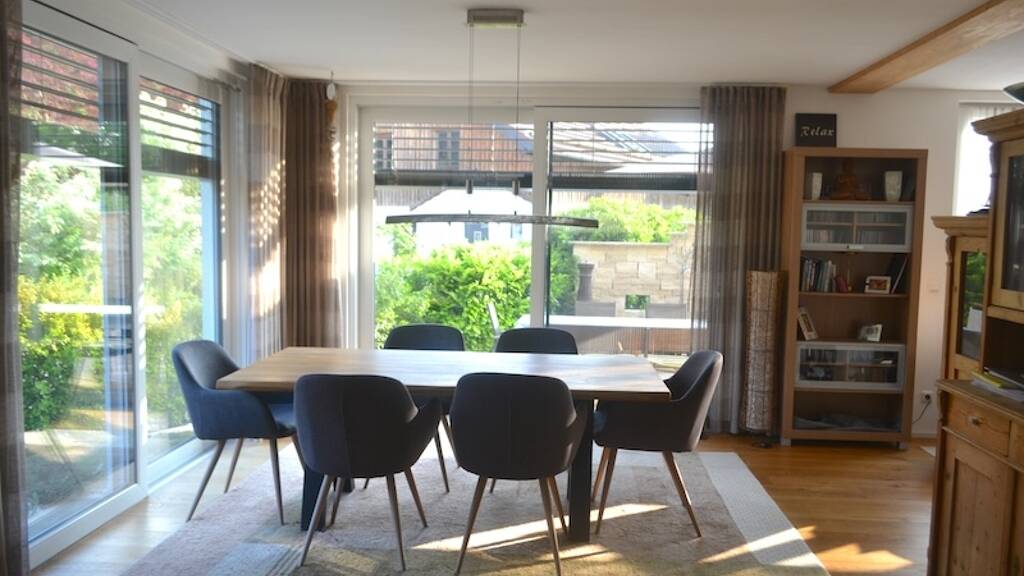 Dieses freistehende Energiesparhaus A+ mit moderner und zukunftssicherer Erdwärmepumpe (Sole-Wasser) wurde im Jahre 2013 erbaut. Das Erdreich stellt eine nachhaltige und kostenlose Wärmequelle dar. Eine Sole-Wasser-Wärmepumpe ist ein Wärmeerzeuger, der das Erdreich als Energiequelle zum Heizen nutzt. Durch die Nutzung natürlicher und erneuerbarer Energie ist die Sole-Wasser-Wärmepumpe ein energie- und kostensparendes Heizsystem. Die hier verbaute Sole Wasser-Wärmepumpe hat viele Vorteile, sie ist effizient, weil die Temperaturen im Erdreich über das ganze Jahr konstant sind, verbraucht weniger Strom und ist wartungsarm (Quelle: grünes haus). In Verbindung mit einer Fußbodenheizung auf allen Etagen (auch im Keller) verspricht diese Kombination einen hohen Wohnkomfort und nie wieder kalte Füße. Herzstück ist der lichtdurchflutete Wohn- und Essbereich mit Panoramaverglasung und Zugang zu zwei sonnigen Terrassen - perfekt für Familie und Gäste. Die großzügig gestaltete Einbauküche in U-Form bietet enorm viel Stauraum und verspricht Freude am Kochen. Auch die modernen Auszüge bis zu 110 cm Breite machen hier den Unterschied zu vielen Standardküchen. Bestens ausgerüstet ist diese beeindruckende Küche mit einer Siemens Edelstahl Ab/-Umlufthaube mit Lichtkonzelt und Metallfilten, einer Siemens Glaskeramik-Kochstelle mit touch-Control - 4 HighSpeed Kochzonen sowie einer Kindersicherung (Quelle: Auftragsbestätigung multicase), Geschirrspüler, einem Einbaubackofen in ergonomischer Höhe sowie einem Side-by-Side-Kühlschrank mit Eiswürfelbereiter und Barfach. Im Obergeschoss bieten zwei Kinderzimmer mit Schlafgalerie und das Elternschlafzimmer mit begehbarem Kleiderschrank. Ein großzügiges Tageslicht-Badezimmer im Obergeschoss mit Wanne, Dusche und Doppelwaschtisch ergänzt sich ideal mit der im Untergeschoss geplanten Sauna samt Dusche (Raum nicht ausgebaut). Das Kellergeschoss bietet viel Platz für Ihre persönlichen Dinge, dazu gibt es noch ein kombiniertes Home-Office-Gästezimmer. In der Garage und im Carport sind Ihre Fahrzeuge bestens geschützt und werterhaltend untergebracht.