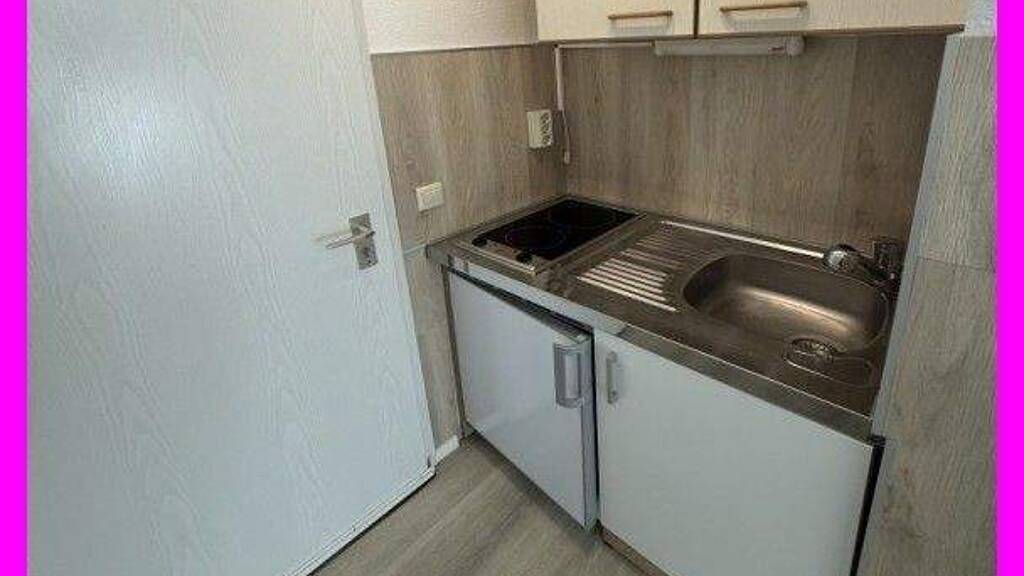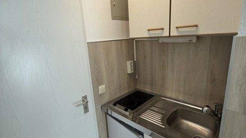 Die Wohnung ist mit einer Single-EBK ausgestattet. Diese ist farbig, verfügt über 2 Ceranfelder, eine Spüle und einen Kühlschrank mit Gefrierfach. Ein Oberschrank ist ebenfalls installiert.
