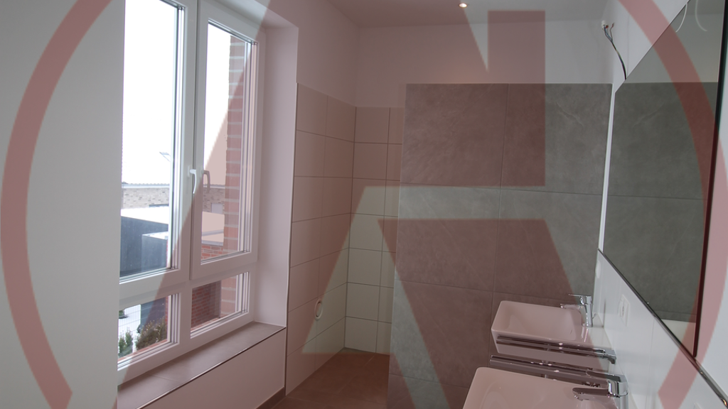 Das Badezimmer im Obergeschoss überzeugt mit einer Eckbadewanne, zwei Waschtischen sowie großformatigen Fliesen in stilvoller Betonoptik. Diese verleihen dem Raum eine zeitlose Eleganz und ein luxuriöses Spa-Ambiente. Große Fenster sorgen auch hier für viel Tageslicht und ein angenehmes Raumgefühl.