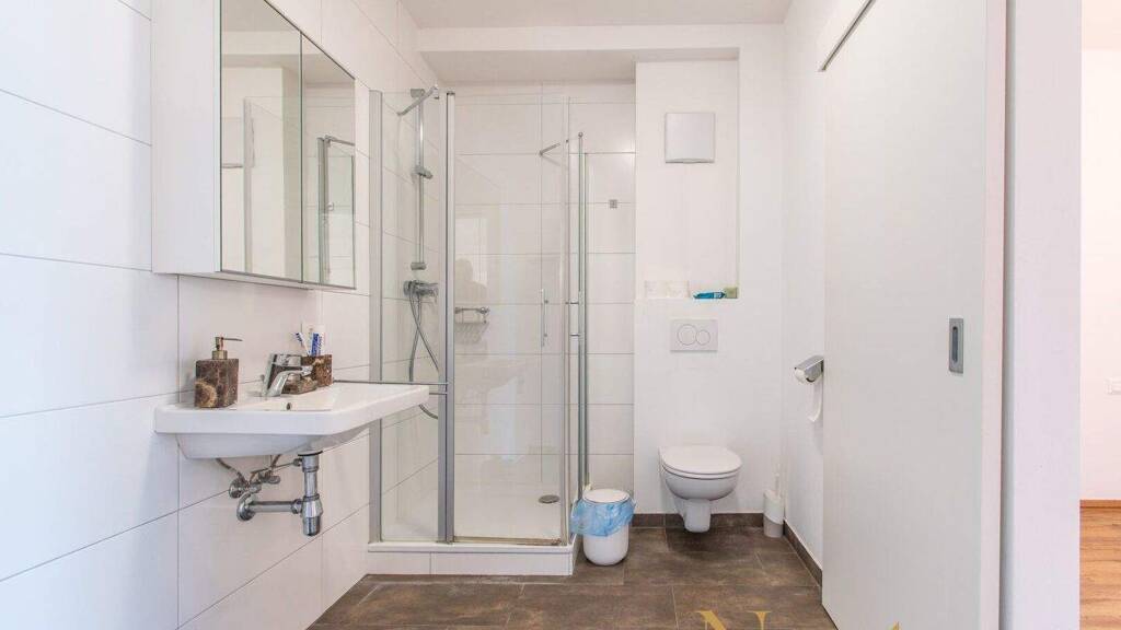 - Badezimmer mit Dusche, WC und Waschmaschinenanschluss