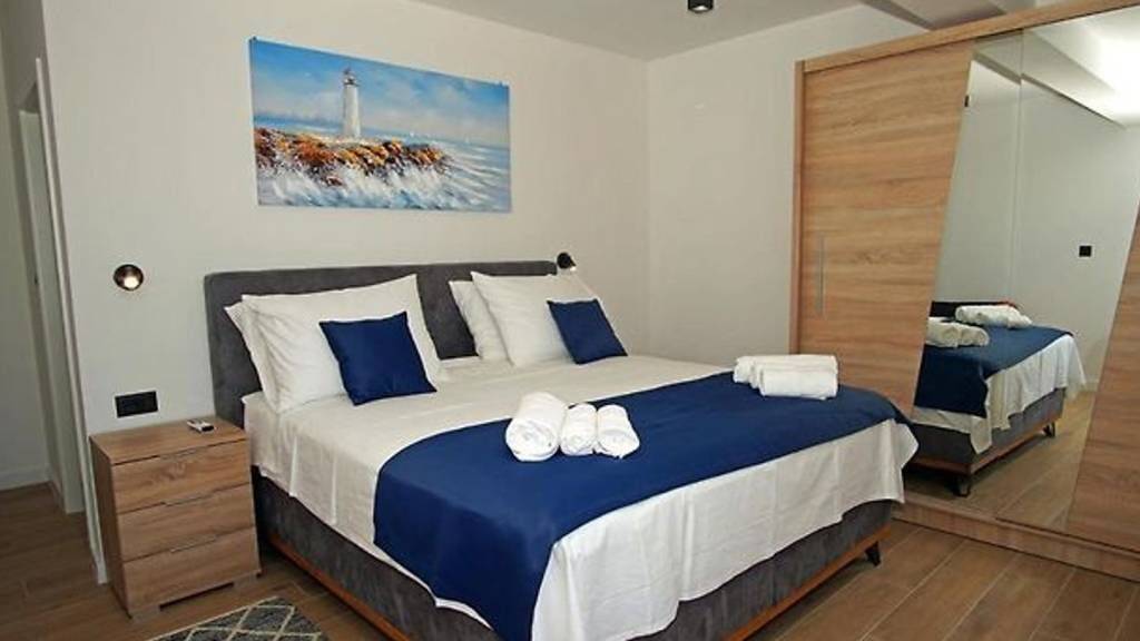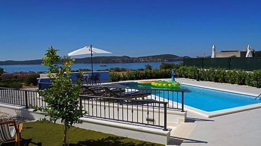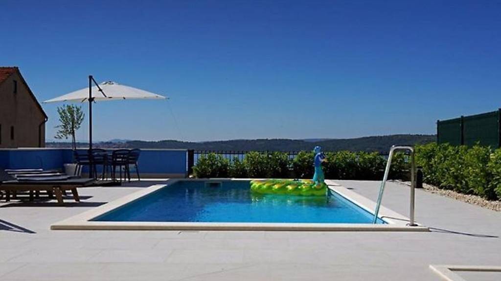 Wir verkaufen eine neue Villa in idealer Lage in der Nähe der historischen Stadt Trogir. Die Villa besteht aus Erdgeschoss und ersten Stock, die durch interne Marmortreppen verbunden sind. Die untere Etage besteht aus einer Küche mit Kochinsel und einem großen Esszimmer sowie einem geräumigen Wohnzimmer mit Zugang zur Terrasse mit Meerblick. Auf dieser Etage befindet sich auch ein Schlafzimmer mit eigenem Bad. Auf der ersten Etage befinden sich vier komfortable Schlafzimmern mit Badezimmern en suite. Jedes Zimmer hat einen wunderschönen Blick auf das Meer und die Umgebung. Diese Villa verfügt über einen wunderschön gestalteten Garten mit Kinderspielplatz, Rasenfläche, Olivenbäumen und mediterranen Pflanzen. Darüber hinaus gibt es auf der Terrasse einen beheizten Swimmingpool sowie einen Ort, an dem Sie die Sonne und den herrlichen Meerblick genießen können. Auf der Rückseite der Villa gibt es eine Sommerküche mit Grill. Auf der rechten Seite des Hauses befindet sich eine überdachte Terrasse mit Sitzgelegenheit, Esstisch und schönem Blick auf das Meer. Die Villa verfügt über fünf nicht überdachte Parkplätze. Beim Bau wurden hochwertige Materialien verwendet (Keramikfliesen, Isolierung, Klimaanlage). Das Interieur ist mit hochwertigen Möbeln und moderner Technik ausgestattet. Diese Villa garantiert dem zukünftigen Eigentümer einen angenehmen Aufenthalt, egal ob er darin wohnen oder vermieten möchte. Infrastruktur: Wasser, Strom, Klärgrube, asphaltierte Zufahrt.