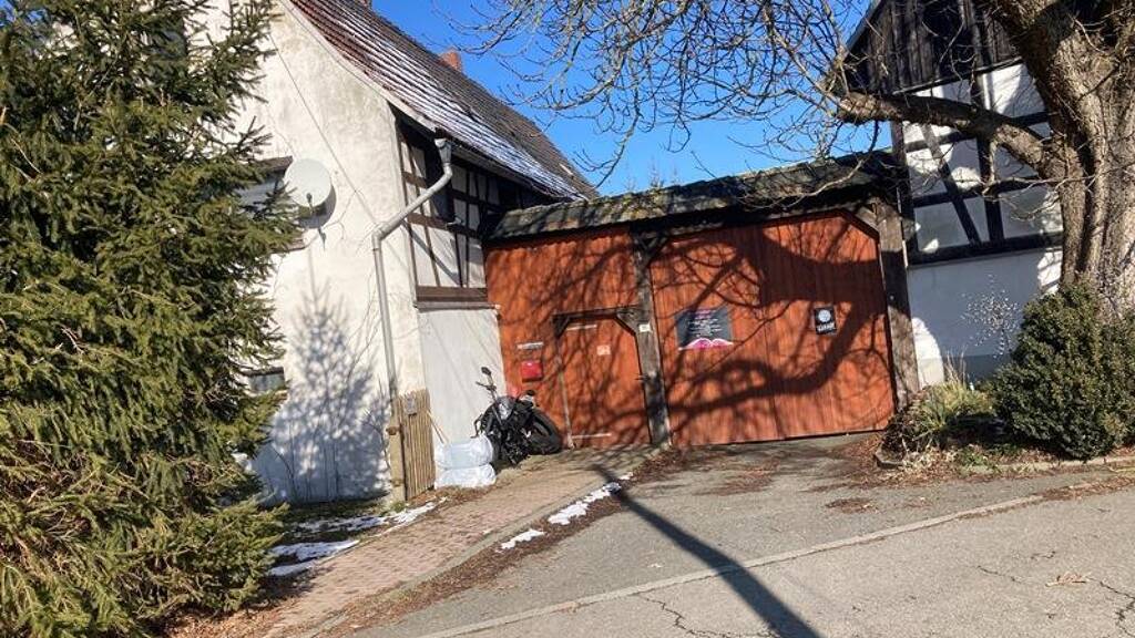 - an der Straße ein Fachwerkgebäude, daneben ein Holzverschlag