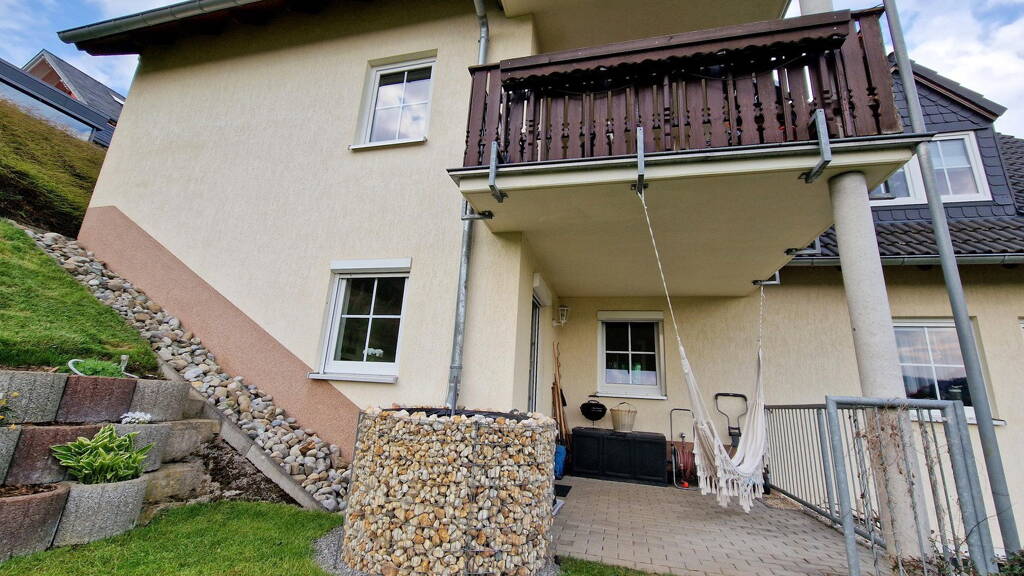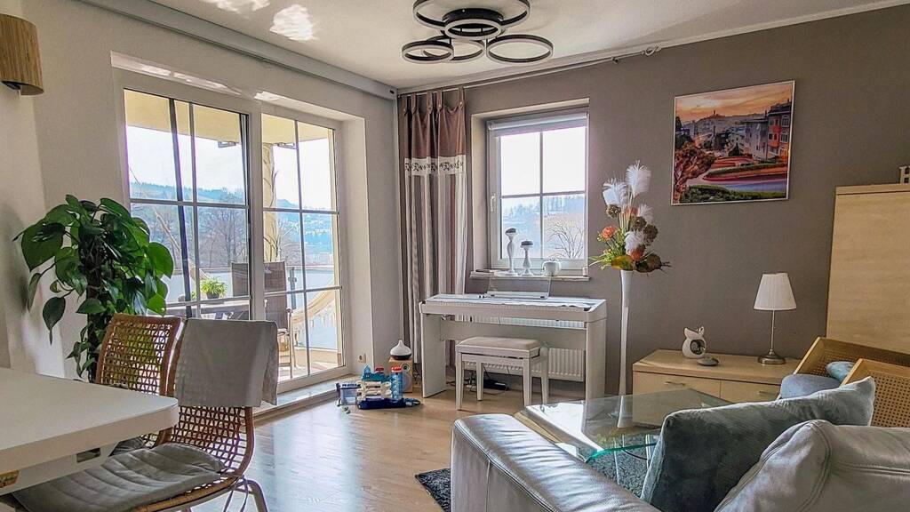 Gepflegte, lichtdurchflutete 4-Zimmer-Maisonette mit 93 m² Wohnfläche über zwei Ebenen im ruhigen, grünen Schwarzenberg-Wildenau. Der unverbaute, atemberaubende Blick auf Schloss Schwarzenberg - sichtbar vom großzügigen Balkon, von der eigenen Terrasse und vom offenen Wohn-Ess-Bereich - macht diese Wohnung einzigartig. Die versetzte Hangbauweise sorgt für zusätzliche Privatsphäre.