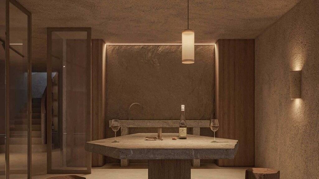 Seine traditionelle Steinfassade steht im Kontrast zu den innovativen, mit der Kelle gegl?tteten Decken, W?nden und T?ren im Inneren, die eine raue, warme Textur aufweisen und aussehen, als seien sie im Lauf der Zeit sanft abgenutzt worden. Die Verschmelzung zeitgen?ssischer und rustikaler Stile ist im gesamten Haus zu erkennen, wo ikonische Designst?cke neben freiliegenden Holzbalken, ma?gefertigten M?beln des Studios und einer gro?en, skulpturalen Treppe koexistieren, die zum Hauptschlafzimmer f?hrt. Naturstein wird mit Eichenholz und einheimischem Marmor kombiniert und schafft so eine harmonische Umgebung, in der einige architektonische Details wie das Kopfteil im zentralen Raum, die Snackbar in der K?che oder die Kaminverkleidung durch ihr dreidimensionales Volumen hervorstechen.