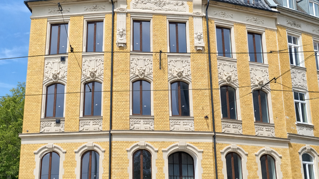 Die Erdgeschoss- und ersten Obergeschosswohnungen verfügen über Rundbogenöffnungen, die dem Gebäude eine einladende Atmosphäre verleihen, während das Hochparterre durch ein Gurtgesims hervorgehoben wird. Das erste Obergeschoss ist zusätzlich durch Jugendstile Schmuckbekrönungen der Fenster ornamental gestaltet, was dem Haus eine besondere Pracht verleiht.