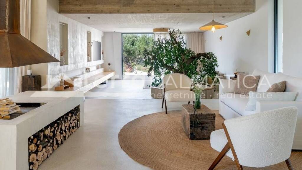 Das Innere der Villa wurde sorgfältig gestaltet, um die Schönheit der natürlichen Umgebung hervorzuheben und Harmonie zwischen Innen- und Außenbereich zu schaffen. Das offene Konzept des Erdgeschosses verbindet zwei Wohnzimmer - "Zen" und "Olive", die Küche und das Esszimmer, wobei ein moderner Kamin aus Beton und Mikrobelag im Mittelpunkt steht, der dem Raum Wärme und den Eindruck eines künstlerischen Details verleiht. Zahlreiche Schiebewände verwischen die Grenze zwischen Innen- und Außenbereich und sorgfältig ausgewählte Materialien - lokaler Stein, Eiche, Esche und Beton - schaffen eine Mischung aus mediterraner Tradition und modernem Design. Die Böden bestehen aus einer einzigartigen Kombination aus Steinteppich und Mikrobelag, die dem Innenraum ein Gefühl von Luftigkeit und einem Gefühl von durchgehendem Raum verleiht. Der Raum wird auch durch handgefertigte Möbelstücke wie einen massiven Eschentisch und Holzklötze aus der Werft besonders aufgewertet, die dem Innenraum Persönlichkeit und Wärme verleihen.