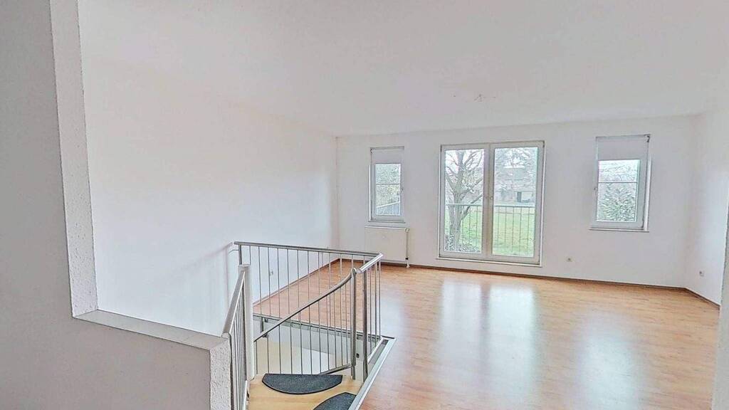 In der unteren Etage der Immobilie, die über eine schicke Wendeltreppe mit Holzstufen und metallischen Handlauf erreicht wird, erwartet Sie ein zweiter, großer Wohnraum, in dem Sie Ihre persönliche Ruheoase einrichten können. In den Sommermonaten des Jahres bietet eine schöne Terrasse mit angrenzender Grünfläche eine herrliche Erweiterung des bereits vorhandenen Wohnraumes.